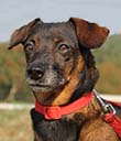 Tramp kříženec jezevčíka, pes, narozen přibližně v 6/2014, 29 cm, 5,5 kg. Do útulku byl přivezen MP. Měl na sobě pouze duhový látkový obojek s kostičkami, bohužel nemá žádné označení. Tramp je milý, kontaktní a velmi hravý psí kluk. V kotci si ihned všiml plyšového zvířátka, kterému dal co proto. Na vodítku chodí dobře a ostatních psů v kotcích si nevšímá. Našel domov v Horních Počáplech. |